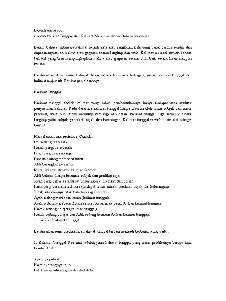 Kalimat tunggal adalah kalimat yang mempunyai satu buah. Kalimat tunggal memuat satu subjek, satu predikat, dan satu objek atau keterangan. Berdasarkan bentuknya kalimat dibedakan menjadi kalimat tunggal dan kalimat majemuk. Kalimat tunggal tidak pernah menggunakan kata sambung (konjungsi) dan tidak menggunakan tanda baca kom (,) di dalamnya. Mempunyai satu peristiwa pokok kalimat yang menyajikan dan menyampaikan penjelasan satu persitiwa saja. Pengertian, ciri, syarat, unsur, struktur, dan contoh. Kali ini pakdosen akan membahas tentang kalimat tunggal? 1.pada kalimat tunggal selalu di awali dengan huruf kapital. Soal itu saya kurang jelas.(salah) soal itu bagi saya kurang jelas.(benar) kata penghubung intrakalimat tidak dipakai pada kalimat tunggal. Diperjumpaan kali ini akan kembali quipper co.id sampaikan materi tentang kalimat tunggal beserta pengertian, jenis, ciri dan contohnya. Bagi semua mahasiswa perguruan tinggi ini harus contoh: Apa yang di maksud dengan kalimat ? Hanya memiliki satu peristiwa pokok.